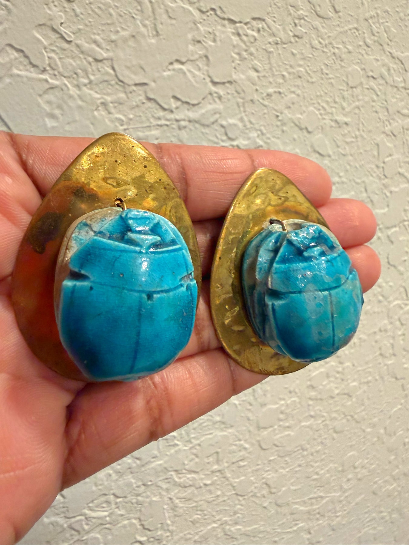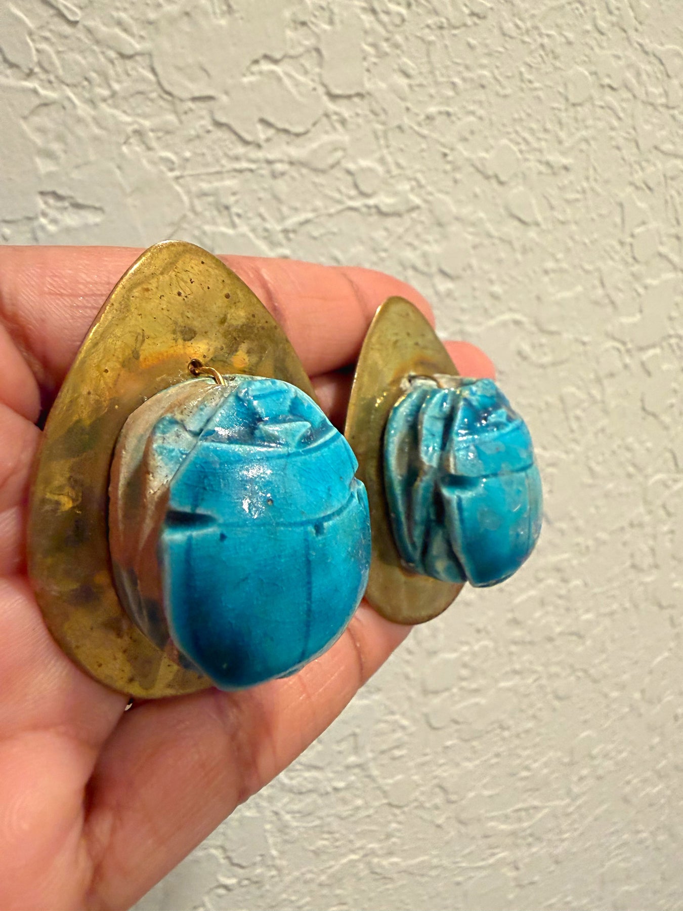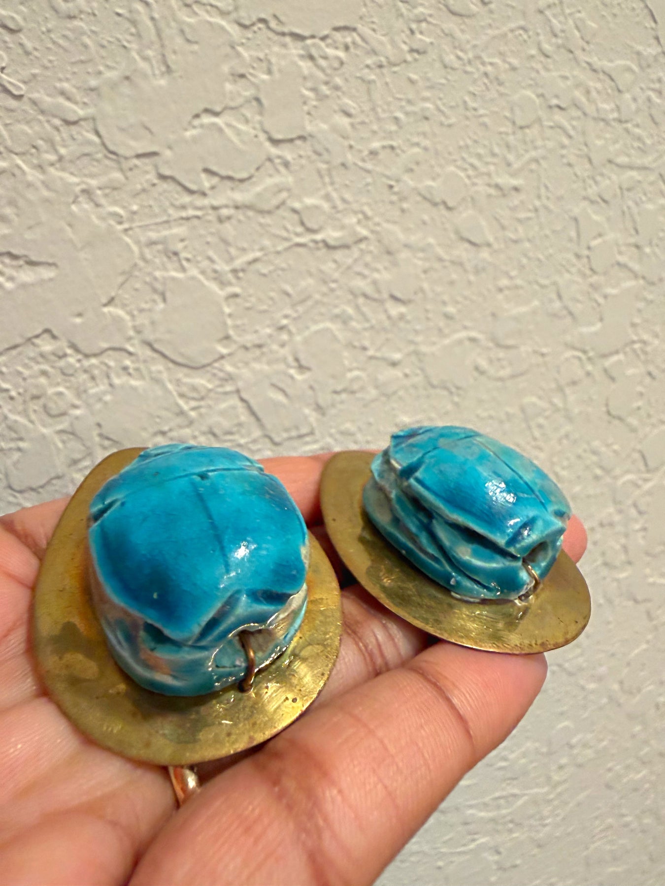 Vintage 60s - 70s Artisan Turquoise Blue Egyptian Revival Scarab Beetle Statement Runway Clip Earrings