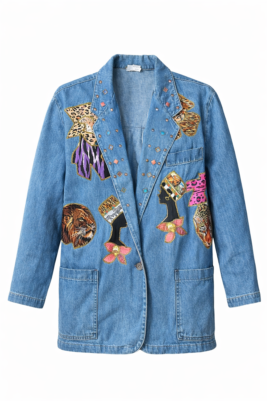 This jacket is fire and one of a kind appliqué. Please see photos.